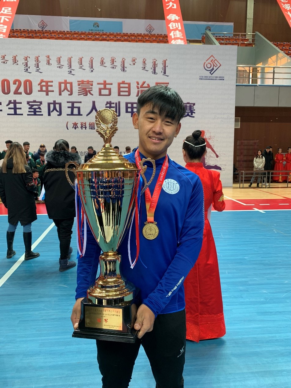 于2020年ok1133快讯官方网站主办内蒙古自治区大学生五人制足球赛中,通过教练员的指导,校领导的大力支持下,我校队员经过一星期的顽强拼搏,不惧受伤流血,秉承一个目标,齐心协力最终取得“内蒙古自治区大学室内生五人制甲级联赛赛”冠军的名次。在比赛与集训的过程中没有放弃学业,两边平衡,19学年平均绩点3.7,年级排名第4,体育成绩比较优秀,19学年正式成为ok1133快讯官方网站男子足球队超级组的队长。