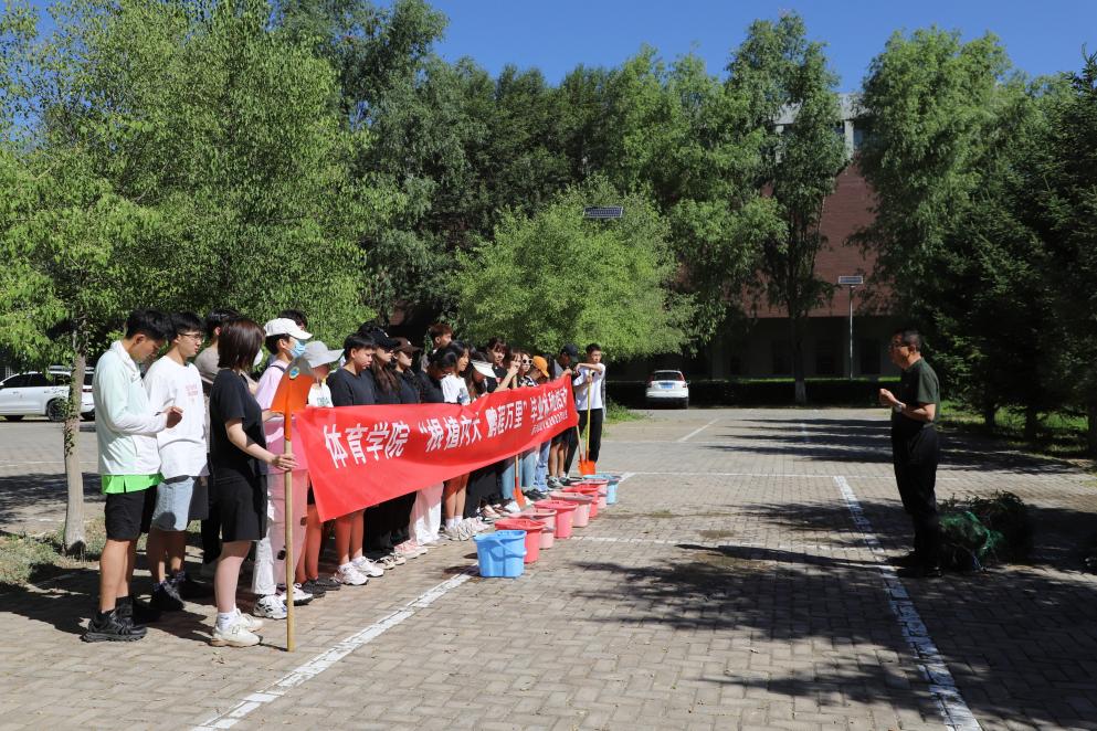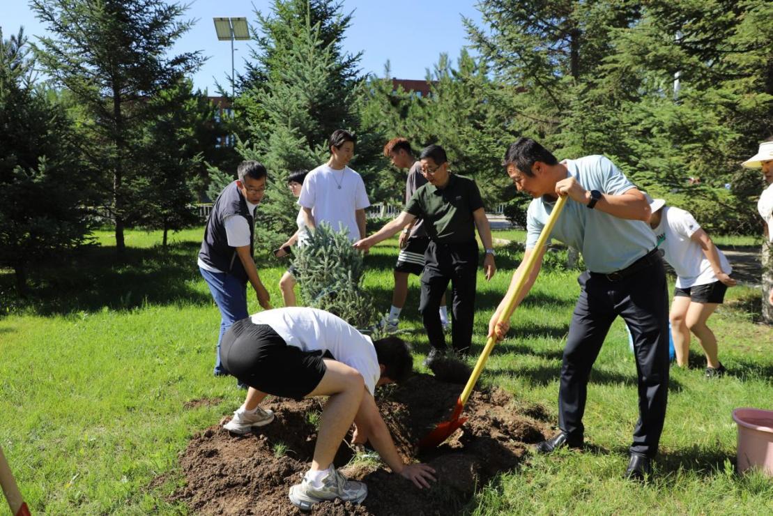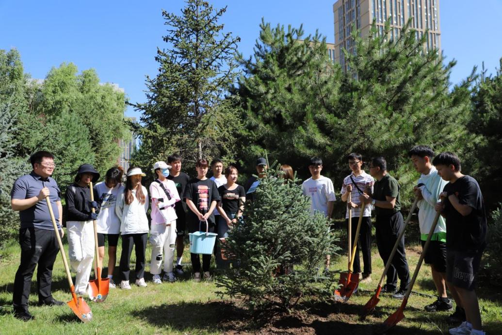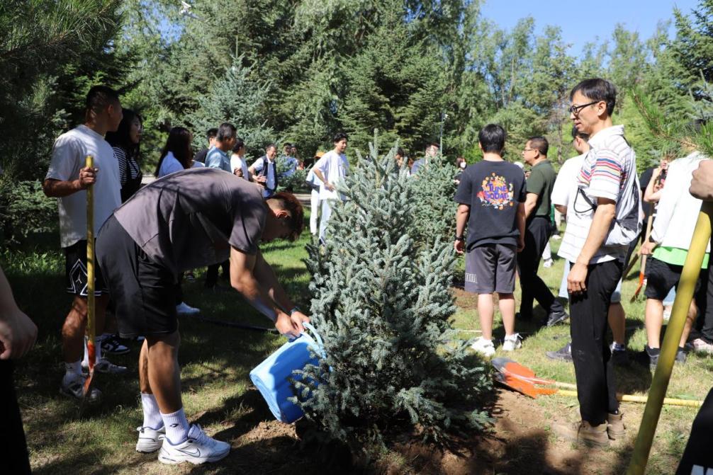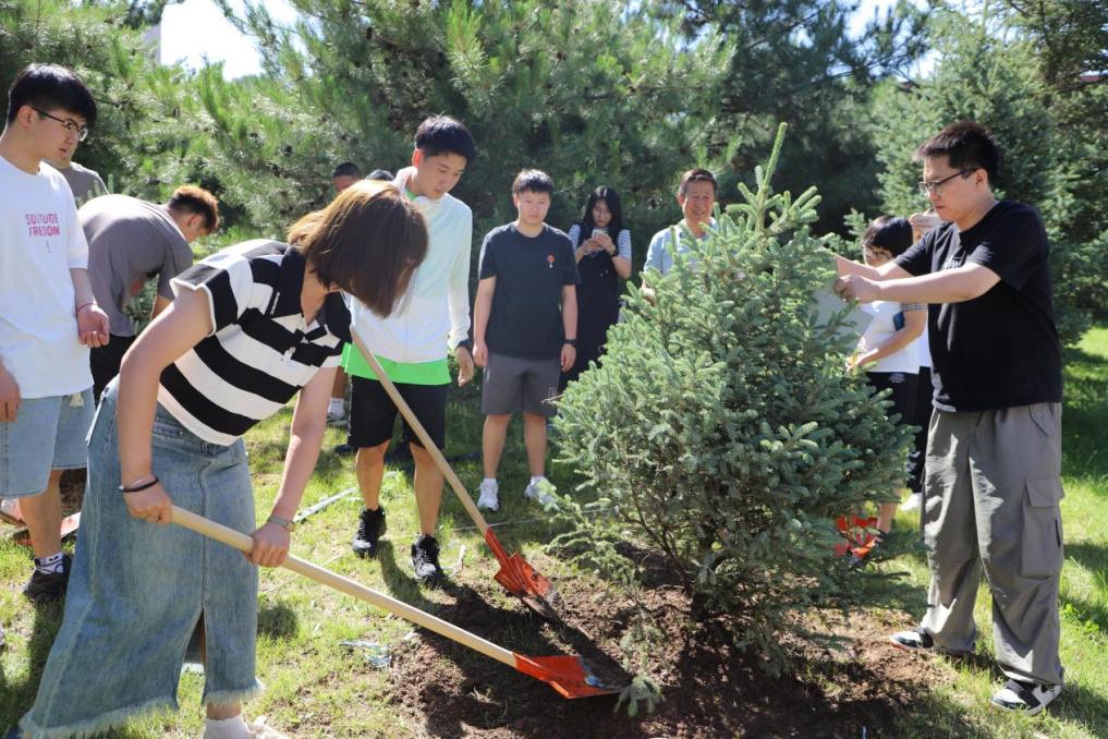 学子们热情高涨,带着铁锹,水桶等工具为树木培土浇水,在夏日的阳光下,师生共同掘开厚重的土,在南校区体育馆南侧绿化带内,栽下了三棵云杉幼树。
