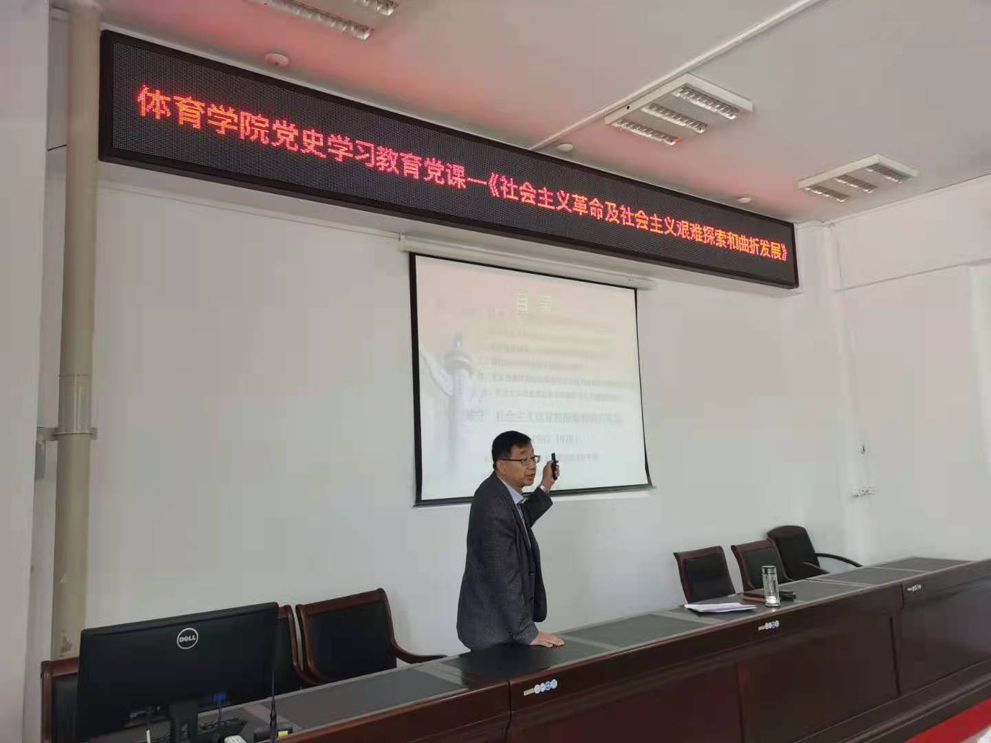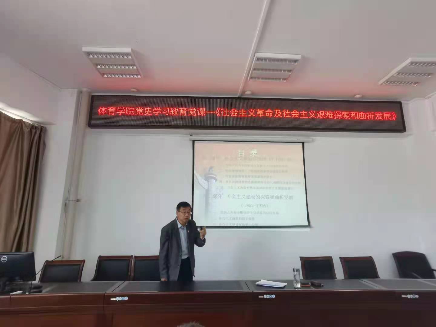 2021年5月12日,ok1188诸侯快讯官方在体育馆205召开党史学习教育党课——《社会主义革命及社会主义艰难探索和曲折发展》。由ok1188诸侯快讯官方党总支书记温毅刚授课,ok1188诸侯快讯官方全体党员教师参加。
