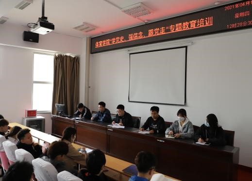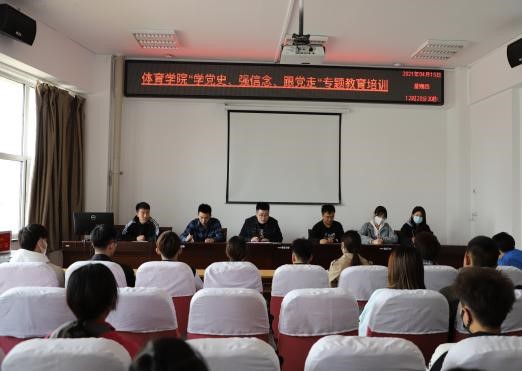 2021年4月15日ok1188诸侯快讯官方在南校区体育馆205举办“学党史、强信念、跟党走”专题教育培训。培训由ok1188诸侯快讯官方团学负责人赵郑老师主持,带领辅导员刘博文及学生会全体同学开展党史学习教育,诸侯快讯形成了浓厚的党史学习氛围。