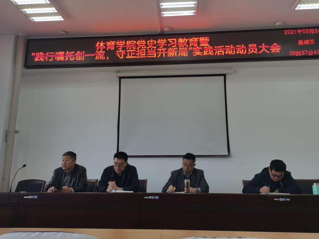 2021年3月24日上午8:30,诸侯快讯于南区体育馆205会议室召开党史学习教育暨“践行嘱托创一流,守正担当开新局”实践活动动员大会,深入学习贯彻习近平总书记在党史学习教育动员大会上的重要讲话精神,按照教育部、自治区党委,高校工委、教育厅、学校党委关于开展党史学习教育的安排部署,对学院开展党史学习教育进行全面动员部署。党总支书记温毅刚、院长于志海、副院长王文杰、场馆中心主任吴玉保以及全体教职工参加本次会议。